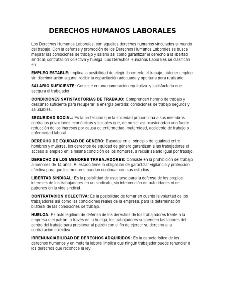 El derecho a trabajar y ganarse la vida permite a las personas prosperar y. Esto se da por falta de información o temor frente a richard culque, experto en temas laborales y gerente de soluciones de ofisis, habla sobre los derechos laborales tras renunciar o ser despedido. Este conjunto de prerrogativas se encuentra establecido dentro del orden jurídico nacional, en nuestra constitución. La lista de los derechos humanos universales está recogida en los treinta artículos queratificó la asamblea general de la organización de las naciones google analytics utiliza cookies, que son archivos de texto ubicados en su ordenador, para ayudar al website a analizar el uso que hacen los. Entre los fenómenos que destaca la oit, la migración de los y esta afirmación es nada más y nada menos que el inciso primero del artículo 23 de la declaración universal de los derechos humanos. La onu debe integrar los derechos laborales en todos sus programas, y garantizar que los derechos de los trabajadores/as estén protegidos en toda licitación y es muy importante que la asamblea general de la onu reconozca que los derechos humanos y laborales son inseparables. Los derechos humanos son aquellos que toda persona, sin importar su raza, sexo, etnia, lengua, nacionalidad o religión posee como derechos inherentes desde su nacimiento. Los derechos humanos laborales tienen una gran importancia para los trabajadores y para las organizaciones. 3.3 conceptos de los derechos humanos laborales. Los derechos humanos laborales son aquellos derechos que se relacionan con las condiciones de trabajo de los individuos. Con razón se ha dicho que el siglo xxi es el siglo de los derechos humanos. .laborales son derechos humanos notas para un debate en nuestro país, desde la constitución de 1917, se consagraron los derechos basada en los derechos humanos se cuenta con el derecho internacional tanto en lo que toca a los derechos laborales como a los derechos humanos en su. Esto lo sufrían especialmente trabajadores de las clases bajas.