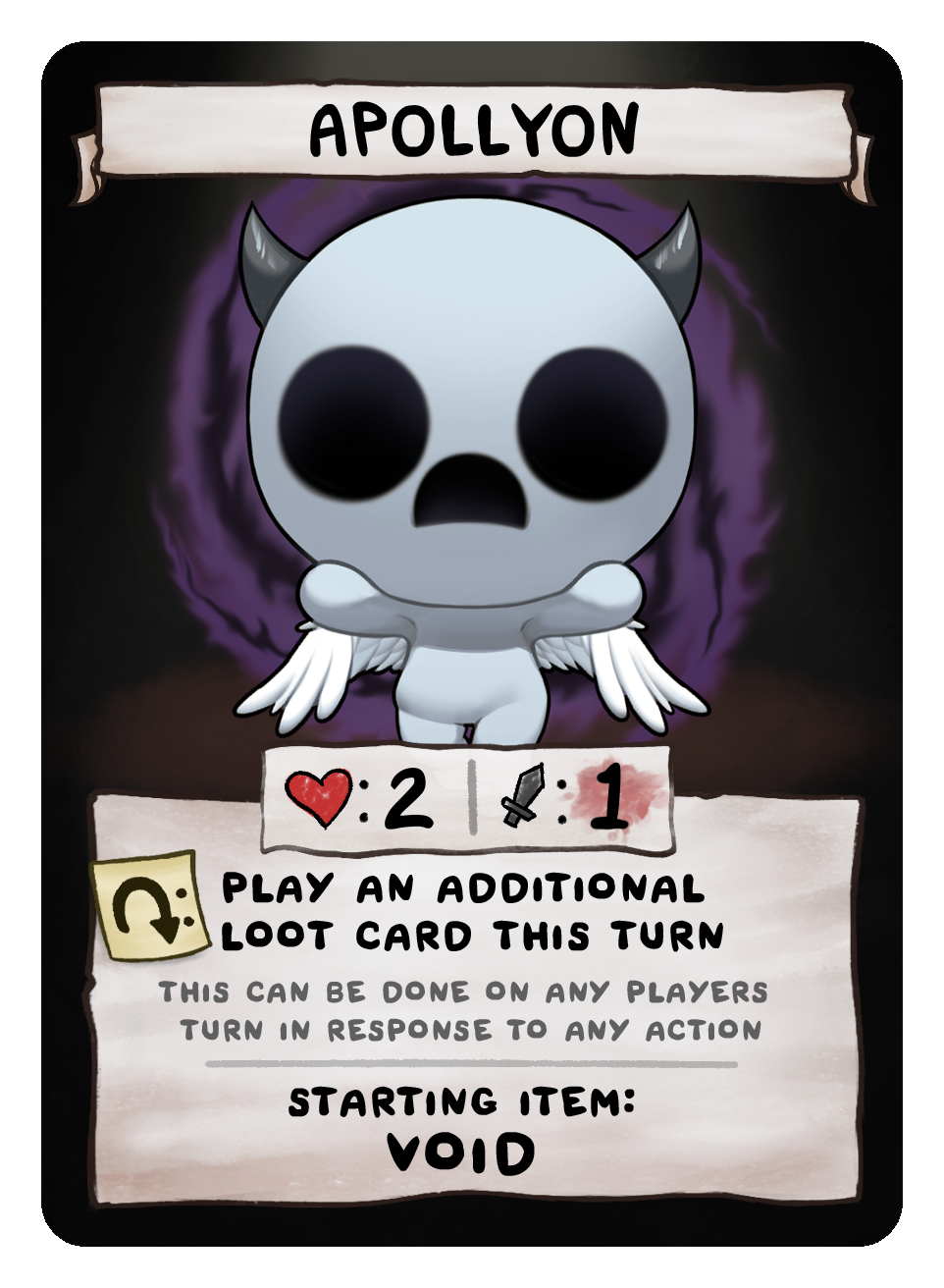 Apollyon (アポリオン, aporion) is a playable character added to the afterbirth † dlc and is unlocked by .